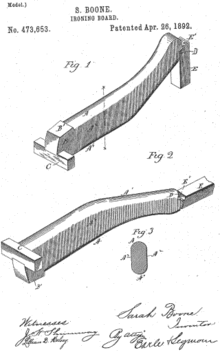 Sarah Boone (1832-1904) was an African American inventor who on April 26, 1892, obtained United States patent rights for her improvements to the ironing board. Boone's ironing board was designed to improve the quality of ironing sleeves and the bodies of women's garments. The board was very narrow, curved, and made of wood. The shape and structure allowed it to fit a sleeve and it was reversible, so one could iron both sides of the sleeve.[1]