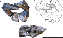 The holotype, MDT-PV 2, was found in the upper Lower Member of the Bajo Barreal Formation, dating from the Cenomanian to Turonian ages. It consists of an almost complete skull with lower jaws, articulated with the first seven vertebrae of the front neck. Several neck parts, among them the entire atlas and fourth neck vertebra, were too eroded to be salvaged. The specimen represents an elderly individual. It is one of the few titanosaurs for which skull material has been found.[3] Uniquely, at the side of the neck an elongated structure was discovered that was identified as an ossified tendon.[3]