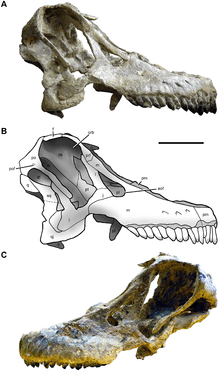 The describing authors indicated nine unique distinguishing traits, autapomorphies. The eye socket is large, equalling 40% of the length of the skull. The ascending branch of the maxilla has a complex connection with a top process of the lacrimal bone, being wedged between its outer side and inner side. The inner edge of the rear part of the ascending branch of the maxilla touches the rim of the bony nostril with a low but distinct ridge. The ascending branch of the quadratojugal has at its lower rear a tongue-shaped process overlapping the rear of the quadrate. In the braincase there are three separate exits for the nervus trigeminus. An inner vein channel connecting the infundibulum with the brains stem, is lacking. The premaxillary teeth are positioned vertically, the maxillary teeth are inclining to the front and the dentary teeth are inclining to the rear. The middle neck vertebrae have strut-like, instead of plate-shaped, ridges between the front joint processes and the vertebral centrum. A long and thin ossified tendon is running along the low side of the series of neck vertebrae and neck ribs.[3]