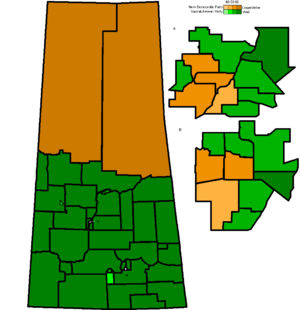 The 27th Saskatchewan general election was held on November 7, 2011, to elect 58 members of the Legislative Assembly of Saskatchewan (MLAs).[1] The election was called on October 10 by the Lieutenant Governor of Saskatchewan, on the advice of Premier Brad Wall.[2] Wall's Saskatchewan Party government was re-elected with an increased majority of 49 seats, the third-largest majority government in the province's history. The opposition New Democratic Party was cut down to only nine ridings, its worst showing in almost 30 years.