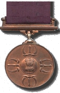The medal itself is a small one. It is cast in bronze with a radius of 13/8 inch. In the centre, on a raised circle, is the state emblem, surrounded by four replicas of Indra's Vajra, flanked by the sword of Shivaji. The decoration is suspended from a straight swiveling suspension bar, and is held by a 32 mm purple ribbon.
