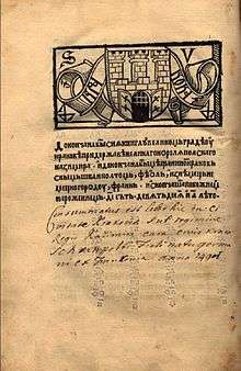 "Octoechos" and "Book of Hours" has the following colophon, in which the text is typed without spaces, making it difficult to understand and produced several variants of its interpretation. For example, this lack of clarity has allowed the Polish literary critic K. Estrayher to say that publishers could be two people: the Slav Sviatopolk and a German, a native franc.[14]