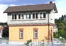 Schwenningen (Neckar) station is one of two stations in Villingen-Schwenningen in the German state of Baden-Württemberg. The other is Villingen (Schwarzwald). Schwenningen owes its connection to the railway to Johannes Bürk, who had demanded a route through Schwenningen to promote the local watch industry, which included his own factory. The original plans involved a route through Niedereschach.[3] The station is located at the Neckar, south of central Schwenningen. It is located at 695 metres above sea level on the Rottweil–Villingen railway. Originally the station was 540 metres long and up to 56 metres wide. The complex included a station building and a goods shed.[4]