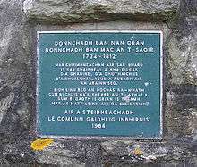 Donnchadh Bàn Mac an t-Saoir (usually Duncan Ban MacIntyre in English; 20 March 1724 – 14 May 1812)[19] is one of the most renowned of Scottish Gaelic poets and formed an integral part of one of the golden ages of Gaelic poetry in Scotland during the 18th century. He is best known for his poem about Beinn Dorain; "Moladh Beinn Dòbhrain" (English: "Praise of Ben Doran"). Most of his poetry is descriptive and the influence of Alasdair MacMhaighstir Alasdair is notable in much of it. Despite the Jacobite upheavals during his lifetime, it was his experience as a gamekeeper in Argyll and Perthshire in the employ of the Duke of Argyll which had greatest impact upon his poetry. Moladh Beinn Dòbhrain, stems from this period. The significance of Duncan Bàn's nature themed poetry is such that it has, along with that of MacMhaighstir Alasdair, been described as "the zenith of Gaelic nature poetry".[20]