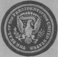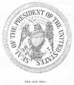The information on Fillmore's seal is from an 1885 article in the Daily Graphic, and (according to Daniel S. Lamont, the private secretary to President Cleveland and one of the article's sources) the 1850 seal was still in use at that time and was used to seal envelopes sent to either house of Congress. The article claims that Stabler made two seals, the other being a smaller one for use on letters, and stated that both were illustrated in the article. While the large seal was illustrated, the rendering of a smaller seal was labeled the "Old Seal" and had only twenty-seven stars, seeming to indicate it would date from 1845 during James K. Polk's administration rather than being a smaller 1850 seal. While Fillmore did use a personal seal (a simple script F in a circular border) it does not appear that this was the smaller seal mentioned. The design on the "Old Seal" was quite similar to the large version, though it was a different rendering of the eagle with small differences in positioning. The inscriptions were also slightly different; the large seal had THE SEAL OF THE PRESIDENT OF THE UNITED STATES, while the smaller one (like the present-day version) omitted the word "The" at the beginning.[14]