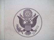 The documented history begins in 1850, when a seal was made after a crude drawing submitted by President Fillmore. It depicted an eagle "displayed with wings inverted", i.e. with its wingtips down, holding an olive branch and three arrows in its talons. The shield is essentially the same as the Great Seal, with a blue chief and red and white stripes and the eagle facing to its right, though there were nineteen stripes and the outermost stripes were red, both unlike the Great Seal. Thirty-one stars were distributed above and around the eagle, indicating that the seal dates from after when California became the 31st state in September 1850. It was made by Edward Stabler, a farmer and postmaster in Sandy Spring, Maryland, who had earlier made seals for the Senate, House of Representatives, and several government departments.[14] Stabler had also made a seal for the Vice President in 1846, and the correspondence surrounding it indicated that even earlier vice presidential seals existed, so presumably earlier presidential seals existed as well.[15] The president's seal was described by Benson Lossing in 1856 as "round, with an eagle upon it" (contrasting it to the seal used during the Continental Congress).[10]