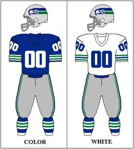 When the Seahawks debuted in 1976, the team's logo was a stylized royal blue and forest green osprey's head based on Northwestern tribal art.[32] The helmet and pants were silver while the home uniforms were royal blue with white, blue and green arm stripes. The road uniform was white with blue and green arm stripes. Black shoes were worn for the first four seasons, one of the few NFL teams that did in the late 1970s. They then changed to white shoes in 1980.[33]
