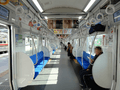 Seating consists of longitudinal bench seating throughout. Wheelchair spaces are provided in the two outermost cars at each end of eight-car sets and in the 32100 cars of two-car sets.[3] Priority seats are provided at the end of each car.[3] Sets built from fiscal 2013 feature LED lighting and transparent overhead luggage racks in place of the earlier stainless steel pipe racks.[5]