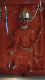 6. In order to locate and secure this place the immediate head Acharya with his meditation created a specific idol of Adhishtayak Dev(installant god) smirking and wearing a crown and riding a lion. He has a drum in his right hand,an ewer in left hand and a knife in waistband with many ancient symbols embossed on it. With a beast under right leg and a small animal near left foot.It is Said that the famous Mughal emperor Aurangzeb and his army during his expedition to destroy every Jain and Hindu temple between Delhi and Mandav royal route passed through this place but due to the power of this god they couldn't see it. The ruins of Mandav temples are living proof. Also the Agarji Shantinath temple in Ratlam was protected by erecting towers overnight. During the course of time due to frequent coating of saffron the real look of idol was hidden and pilgrims started taking it for a God Manibhadra idol. But the 80 kg of coating cracked in 1990 and the real look was observed which can now be seen.
