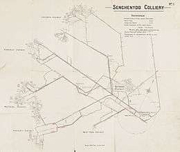 Senghenydd—Senghennydd in Welsh—is situated at the northern end of the Aber Valley, approximately four miles (6.4 km) north-west of Caerphilly[16][17] and eleven miles (18 km) north-west of Cardiff.[18] When geological surveys for coal began in 1890 it was a farming hamlet of around 100 people.[19][20] Coal was found, and sinking of the first mineshaft for Universal Colliery—which was owned and developed by William Lewis[lower-alpha 3]—began in 1891; the first coal was extracted in 1896.[17][22] The colliery's two shafts were both 1,950 feet (590 m) deep, the downcast Lancaster and the upcast York.[23][lower-alpha 4] Development of the pit coincided with the Boer War, and sectors of the underground workings were named after key places in the war, such as Pretoria, or the lifting of the sieges at Ladysmith, Mafeking and Kimberley.[20]