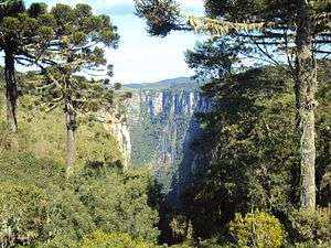 Serra Geral National Park is in the Atlantic Forest biome. It covers 17,302 hectares (42,750 acres). The park was created by decree 531 of 21 May 1992, and is administered by the Chico Mendes Institute for Biodiversity Conservation.[1] The park covers parts of the municipalities of Cambará do Sul in Rio Grande do Sul and of Jacinto Machado and Praia Grande in Santa Catarina.[2] It is made up of two separate sections adjacent to Aparados da Serra National Park.[3]