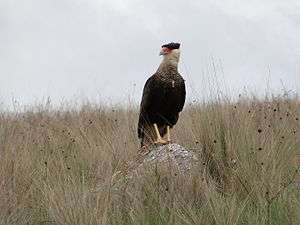 Fauna include bush dog, pampas deer, maned wolf, giant anteater, lontra, titi, giant armadillo (Priodontes maximus), cougar, Brazilian merganser, king vulture, toco toucan (Ramphastos toco), guan, southern crested caracara (Caracara plancus), emu and seriema.[4] Endemic herpetofauna are Hyla ibitiguara, Cinax canastrensis and Odontophrynus sp.[3]
