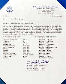 Mrs Alice Craig, wife of the commander Doug Craig, was presented in August 2011 with a Presidential Citation by Major Christopher M Westhoff, US Marine Attaché in Canberra. The citation was issued to Mrs Craig just days she visited the crash site on 14 August 11. It was 68 years to the day since Shady Lady had crash landed there.