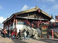Rumors that PortAventura would be investing in a new Bolliger & Mabillard Flying Coaster or Dive Coaster roller coaster emerged in late 2010.[2] In May 2011, speculation that the park was planning to build a hypercoaster that would pass over Dragon Khan arose. Land clearing also began in the summer of 2011.[2] Shambhala was announced to the public on October 24, 2011; the layout of the roller coaster was leaked 2 days earlier.[3][4] The last piece of track was installed in mid-April 2012 following a signing event and the placement of the several country flags on the track.[5] Testing of the ride began in the same month.[6] Following the completion of testing, a ribbon cutting ceremony was held on May 12, 2012 before opening to the public the same day.[1][7] Over 300 workers from countries such as Germany, France, Hungary, Poland, Switzerland, and United States of America took part in the construction of Shambhala.[5]