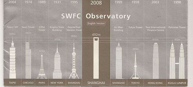 On 14 September 2007, the skyscraper was topped out and is 492 metres (1,614.2 ft),[1][3] making it the 8th tallest building in the world and the fourth tallest structure in Mainland China. The SWFC opened to the public on 28 August 2008, with its observation deck opening on 30 August. The observation deck offers views from 474 m (1,555 ft) above ground level.[6]