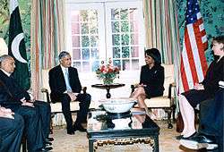 Aziz paid a farewell visit to South Korea to strengthen and enhance the relations with Pakistan.[71] Aziz cautiously supported South Korea's stance while refrained to criticised North Korea.[71] On a three-day state visit, Aziz and his counterpart Lee Hae Chan signed two agreements on cultural exchange and providing human resource management, and improving trade and cultural ties between South Korea and Pakistan.[71] Aziz strongly allied with the United States in the fight against terrorism, and in a meeting with the American journalist, Aziz maintained that: "Pakistan is now ideally positioned to "work with cooperation rather than confrontation as a force for peace, stability and prosperity..".[72] During his tenure, the relations with the United States strengthen and progressed.[73] In 2006, Aziz quoted: "Pakistan-American are based on mutual trust and respect and are long-standing.".[73] During his repeatedly visit to United States, Aziz worked and deliberately approached to U.S. administration build a strategic partnership with the United States, and put efforts to build "robust-broad-based strategic relationship.".[74] Aziz's economical, domestics, and internal reforms, focused on enriching a longer-term sustainable Pakistan-U.S. relationship and contribute immeasurably to both countries joint struggle against extremism.[74]
