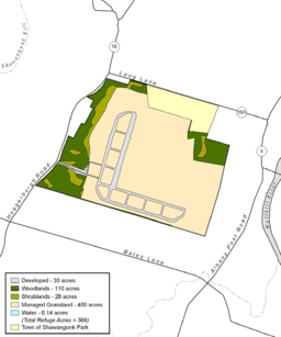 The central area of the property, the former airport, is bounded on all sides by woodland and shrubland (except for a small corridor around the main public access road) which makes up 165 acres (66 ha) of the total. The 400 acres (160 ha) that account for the core grassland also boast the former airport's 3,500-foot–long (1,067 m) runways and equivalent taxiways, taking up about 30 acres (12 ha) along the southern and western bounds of the grasslands. From this open space, it is possible to see the Shawangunk Ridge to the west.