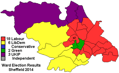 | Map showing the results of the 2014 Sheffield City Council elections. | |||||||||||||||||||||||||||||||||||||||||||||