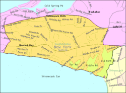 Shinnecock Hills is a hamlet (and census-designated place) in Suffolk County, New York, United States. The population was 2,188 at the 2010 census.[1] It is the home of a leading golf club, Shinnecock Hills Golf Club. Ownership of the area has been the subject of a 2005 lawsuit filed by the Shinnecock Indian Nation.