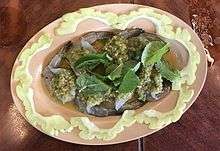 Kung chae nampla (Thai: กุ้งแช่น้ำปลา, pronounced [kûŋ t͡ɕʰɛ̂ː nám.plāː]) is a Thai salad made from fresh raw shrimp soaked in Thai fish sauce and served with chunks of gourd, cloves of garlic, chilies, and spicy sauce.[1] It needs to be chilled before serving for 10 to 15 minutes.[2] As a result, the shrimp flavor will be more salty and tasty. Generally, Thais usually use whiteleg shrimp in this dish.