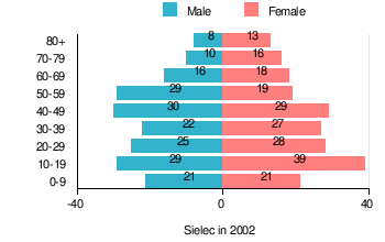 According to the 2002 Poland census, there were 400 people residing in Sielec village, of whom 47.5% were male and 52.5% were female. In the village, the population was spread out with 25% under the age of 18, 34% from 18 to 44, 23% from 45 to 64, and 18% who were 65 years of age or older.[1]