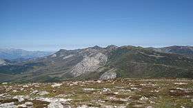 ![]() The Sierra de Híjar range, viewed from Valdecebollas. In the foreground, the peaks of Peña Labra, Tres Mares, and Cuchillón are visible. In the background, Peña Agujas, Cueva del Cobre, and the Picos de Europa. | |