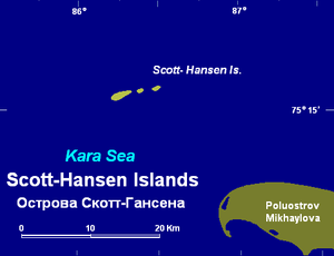 The Scott Hansen Islands (Russian: Острова Скотт-Гансена, Ostrova Skott-Gansena) is a group of three small islands covered with tundra vegetation. It is located in the Kara Sea, about 20 km from the tip of the Mikhailov Peninsula in the coast of Siberia.