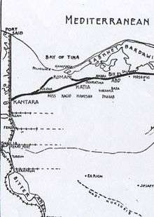 Murray planned a 50,000 strong garrison in the Katia area and obtained authority to build a pipeline to pump fresh Nile water and a railway to transport the infantry divisions and their supplies.[39] He also decided to empty the water cisterns at Moya Harab so the central Sinai route could not again be used by Ottoman columns advancing from Palestine and to maintain some troops at Suez to defend the town.[40] These operations began in February 1916 when construction started on the 25 miles (40 km) stretch of 4-foot 8 inch standard gauge Sinai railway and water pipeline from Qantara/Kantara to Qatiya/Katia.[38][39] By the end of March or early in April 16 miles (26 km) of track, including sidings, had been laid.[41]