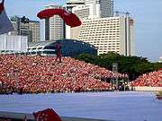 The Singapore National Day Parade (Abbreviation: NDP, Malay: Perbarisan Hari Kebangsaan, simplified Chinese: 国庆庆典; traditional Chinese: 國慶慶典; pinyin: guóqìng qìngdiǎn, Tamil: தேசிய தின அணிவகுப்பு) is a national ceremony in Singapore that, as its name implies, includes a parade on Singapore's National Day on August 9, in commemoration of Singapore's independence that is usually held at the Padang, the National Stadium, various decentralized venues all over Singapore or The Float at Marina Bay.