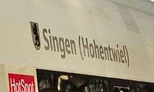 Deutsche Bahn officially call the station Singen (Hohentwiel). Because of its size and its significance for the district of Konstanz, the station is sometimes referred to as Singen Hauptbahnhof locally. In addition, the abbreviations Singen (Hohentw), Singen (Htw) and just Singen are used.