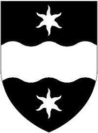 Sable a fess wavy between two pole-stars [Arctic and Antarctic] argent; and for his crest, a ship on a globe under ruff, held by a cable with a hand out of the clouds; over it this motto, Auxilio Divino; underneath, Sic Parvis Magna; in the rigging whereof is hung up by the heels a wivern, gules, which was the arms of Sir Bernard Drake.[33]