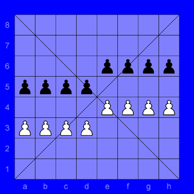 - Second stage: in each move, each player moves any one of his pieces (not a pawn) to any other empty place in his own half of the board, ignoring the usual move rules. Or he can move a pawn one square forwards and this ends the second stage and the third stage starts.