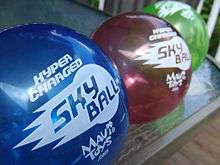 The Skyball is a helium- and air-filled[1] bouncy ball toy sold by Maui Toys. It has received much attention and critical acclaim due to its high restitution, or bounciness.[2] The Skyball is often compared to the popular 1965 Wham-O Superball.[3] The Skyball is advertised as bouncing higher than a 1.5 inch Superball, which is a brand of bouncy ball.[1]