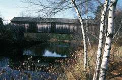 The Slate Covered Bridge is a wooden covered bridge which carries the Westport Village Road (formerly New Hampshire Route 10) over the Ashuelot River in Westport, a village of Swanzey, New Hampshire. The bridge was built in 2001, as a replacement for an 1862 bridge that was destroyed by arson fire in 1993.[2]