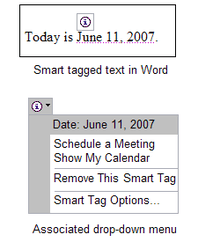 As an example, in Microsoft Word the words "John Smith" would be recognized as a personal name and smart tagged. The list of actions available when clicked might be Open Contact, Schedule a Meeting, Add to Contacts, or Insert Address.