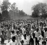 In contrast, the Communist Party was more active, populist, and had support from the rural class due to its tough position taken on economic and social issues.[8] The Communist Party quickly grasped its popularity as it espoused the causes of Pakistan's farmers and labourers against the nexus of zamindars, princely class, and landed gentry.[8] During the 1954 general elections, the Communist Party swiftly gained the exclusive mandate in East-Pakistan and representation in West-Pakistan; earlier in 1950, the Communist Party played a major role in labour strikes for the support of language movement.[9] The Communist Party, with the support from Awami League, formed a democratic government in East-Pakistan.[9] The class struggle reached to its limit when members of PML and Communist Party culminated in a violent scuffle with East-Pakistani police in 1958.[9] The government responded with the dismissing the government of Communist Party in East and then arresting ~1,000 members of Communist Party in West, eventually banning the Communist Party in West as well.[10]