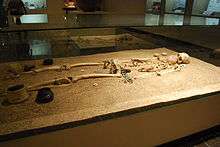 A recent discovery has been the oldest pre Hispanic tomb, dated to between 700 and 500 BCE. It was found in a previously excavated 20-meter-tall pyramid, but in the very center. The occupant is richly attired with more than twenty axes found as offerings, placed in the cardinal directions. The culture is considered to be Olmec although more exact dating needs to be done. The offerings show Olmec influence, such as depictions of wide eyes and lips, but other typical Olmec decorations such as earspools and breastplates are missing. In addition to the axes, there are also more than three thousand pieces made of jade, river pearls, obsidian and amber, from areas as far away as Guatemala and the Valley of Mexico, showing trade networks. The face was covered in a seashell with eye and mouth openings, the earliest example of a funeral mask.[12][15][16] The burial shows that many elements of Mesoamerican burials are older than previously thought.[16]