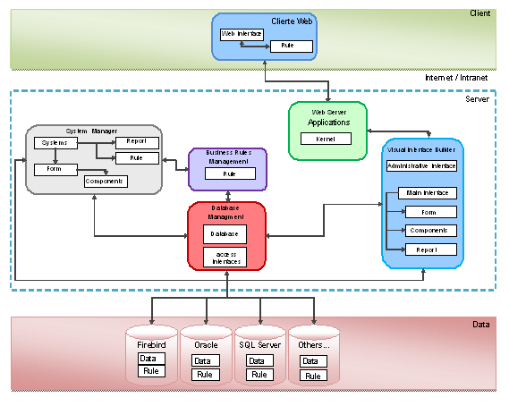 The picture below illustrates some details from Webrun internal architecture and a default execution environment of an application built by Softwell Maker, where business rules can run into three layers: client (JavaScript), server (Java/.NET), and database (Oracle, MS-SQL Server, PostgreSQL, …). We can also realize internals subsystems of Visual Interface Builder (HTML, JavaScript, CSS, PDF, ...), Database Management (Transactions, Procedures, Sequences, …), and System Manager (User’s session, authentication, permissions, …).