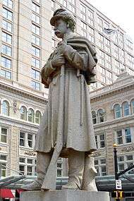 The Lancaster Soldiers and Sailors Monument features a 43-foot (13 m) tall Rhode Island, rectangular granite pillar topped with a statue of a robed woman on a pedestal known as the "The Genius of Liberty".[2] The Genius of Liberty holds a drawn sword and a shield.[2] Her head is crowned with stars.[2] She faces north which, according to legend, allows her to turn her back on the former Confederate States of America, which were defeated in the war.[2]