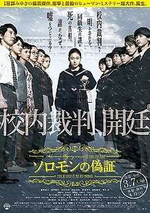 Solomon's Perjury (ソロモンの偽証) are two 2015 Japanese suspense mystery films directed by Izuru Narushima, based on the novel of the same title by Miyuki Miyabe. The first, Solomon's Perjury Part 1: Suspicion (ソロモンの偽証 前篇・事件), was released on March 7 and the second, Solomon's Perjury Part 2: Judgement (ソロモンの偽証 後篇・裁判), was released on April 11, 2015.[1][2]