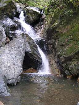 Headwaters rise on the west facing slopes of the inner coast southern Mayacamas Mountains, where the highest peaks are Hood Mountain, elevation 2750 feet (833 m) and Bald Mountain, elevation 2729 feet (826 m), each of which has views of the Pacific Ocean and the Sierra Nevada range. The headwaters cut through gorge and meadow of Sugarloaf Ridge State Park, which boasts 25 miles (40 kilometers) of self-guided trails and the Robert Ferguson Observatory. There is also a 25 foot (eight meter) high waterfall, present only when fed by the winter rains but can persist until late May for high rainfall years such as 2006. In the 100 foot (30 m) deep gorge into which the waterfall spills is a moist mixed forest habitat including California bay laurel, coast redwood, Douglas fir, big leaf maple, cherry holly, coffeeberry, and even tanbark oak. The understory features abundant ferns and boulder laden mosses. A prominent landform in this upper reach created by Sonoma Creek is Adobe Canyon. Locally part of this upper reach flow is sometimes called Adobe Creek. Tributaries near the headwaters include Mount Hood Creek and Graywood Creek.[4]