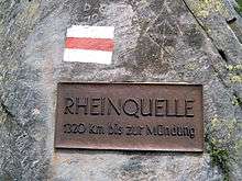 Near the "source of the Rhine" at Lake Toma, there is a well known sign with the (erroneous) information, "1320 km to the mouth" (it's only about 1230 km).[4]