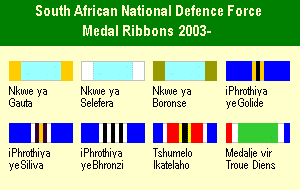 The South African National Defence Force, which was formed in 1994 by amalgamating the SADF, the liberation armies, and the military forces of the former homelands, used the SADF decorations and medals until 2003, when a new series of decorations was instituted: