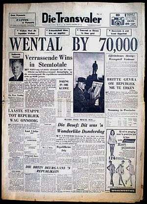 A referendum on becoming a republic was held in South Africa on 5 October 1960. The Afrikaner-dominated right-wing National Party, which had come to power in 1948, was avowedly republican, and regarded the position of Queen Elizabeth II as head of state as a relic of British imperialism.[1] The National Party government subsequently organised the referendum on whether the then Union of South Africa should become a republic. The vote, which was restricted to whites, was narrowly approved by 52.29% of the voters.[2][3] The Republic of South Africa was constituted on 31 May 1961.