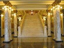 In anticipation of South Dakota's state centennial during 1989, the building was renovated extensively and restored during the administrations of Governors Richard F. Kneip, Harvey L. Wollman, Bill Janklow, and George S. Mickelson. The renovation required 22 years and restored much of the building and its decoration, including the tile floor, to its original appearance.[2] The tiled floor was also repaired; each of the tile workers who did the repairs is said to have been given a heart-shaped stone with which to mark the new floor, as the original workers had.[12] Work began in 2013 to restore stained glass throughout the building with the $2.7 million project concluded in time for South Dakota's 125th Anniversary celebrations October 1.[13]