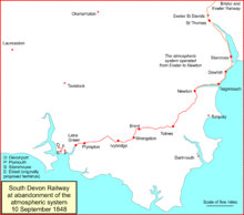 On 18th August a goods train of eleven trucks, weighing 120 long tons (122 t; 134 short tons), travelled the 8 1⁄4 miles (13.3 km), Exeter to Starcross, in 15 minutes.[note 8] On 8th September 1847, besides the usual service of trains hauled by locomotives, four extra ones commenced running, these being propelled by the atmospheric system. This was the first public use of the system on the South Devon Railway. Although the line was opened as far as Newton Abbot, between that station and Teignmouth locomotives were employed, but the piston carriage on the down train went on to Newton, where it was taken off with the superfluous carriages and placed on a convenient line to be attached to the up train when required, so that, on arriving at Teignmouth, where the locomotive was removed, the piston carriage started the train when the signal was given.[14]