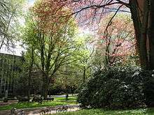 The area was the focus of a Portland Development Commission urban renewal based on a 1982 master plan, becoming an urban renewal district in 1985, and expiring in July 2008.[147][148][149] The park blocks underwent serious renovations in 1987, adding plazas, large flower beds, lighting and irrigation, and newly paved sidewalks.[149][150][151] Several apartment complexes specifically aimed at the middle class were built, including the University Park Apartments (125 units, $10.5 million, quickly sold and converted to condos), South Park Square Apartments (184 units, $16 million, completed May 1988), and Tom Mesher's Gallery Park Apartments (31 units, $3 million).[148][151][152][153][154] In 1987, the New Theater Building of the Portland Center for the Performing Arts was completed immediately next door to the Arlene Schnitzer Concert Hall.[155] The South Park Blocks Association, a commercial and institutional association, was started at that time, to attract residents and consumers to the area and to address security concerns.[151]