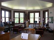 The Southold Lyceum Association (an example of the then-prevalent Lyceum movement in the United States) made a second attempt at creating a library in the town. Organized on October 3, 1871, its purpose was "the improvement and entertainment of its members." It began operations on May 11, 1872 in the home of Jonathan W. Huntting, with H. Howard Huntting as librarian.[3] In addition to lending books, its activities included picnics, lectures, and other fundraising activities, tied in with its purpose of Southold Lyceum Association, of hosting staged plays.[5] An early catalog indicated that annual subscriptions cost $1, and weekly rentals began at 5 cents. The catalog dated June 13, 1884 indicates the library containing 636 books.[6] From 1884-1887 the library was located in a room at the rear of Henry Howell's Drug Store, Henry Howell functioning as librarian.[7] In 1888, the Southold Reading Room Association was formed to house the library. Apparently the maintenance of the library was too burdensome and the Southold Lyceum Association met on May 7, 1896 to dissolve the library.[5] The Association subsequently donated the books to the Southold Union School.[8] A 1947 article noted that, at a time where few schools had their own libraries, "The Lyceum Library enriched the life of this community for more than twenty years and then helped to raise the status of the public school from a district to a union school."[8]