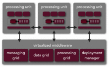 Component Description Messaging grid Handles the flow of incoming transaction as well as the communication between services Data grid Manages the data in distributed memory with options for synchronizing that data with an underlying database Processing grid Parallel processing component based on the master/worker pattern (also known as a blackboard pattern) that enables parallel processing of events among different services