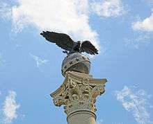 The Spanish–American War Memorial consists of a column of gray granite 54 feet (16 m) high[9] quarried in Barre, Vermont.[20] Atop the column is a bronze eagle with outstretched wings,[9] facing west. The eagle is mounted on a granite globe, which was quarried in Quincy, Massachusetts.[20] A band decorated with 13 stars (representing the original Thirteen Colonies) is carved in high relief on the globe.[9] The globe stands on a square base. The base stands atop a Corinthian capital which crowns the column.[28]
